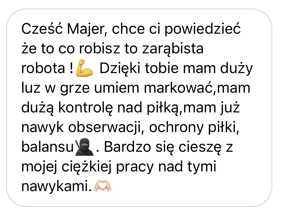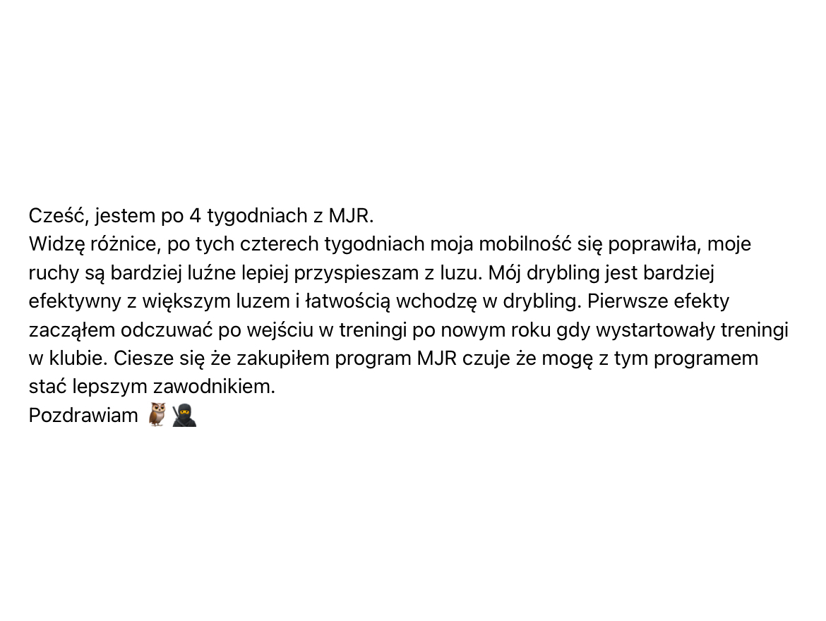 Zobacz, tak samo jak sama szybkość, TYLKO wspaniała technika w rywalizacji nie przyniesie Ci skuteczności w dryblingu. Korzystając z analogii rozwoju obserwacji, która zwiększa użyteczność techniki poprzez rozwinięcie jakości obserwacji, która pozwala Ci kontrolować przestrzeń, przeciwnika i pozwala Ci wraz z IQ podejmować skuteczne decyzje. (Bez skutecznych decyzji jakość techniczna nie ma żadnego znaczenia, bo nie przynosi wyników). Rozwój mobilności, jakości ruchu również zwiększa użyteczność techniki. Podczas pojedynków 1vs1 w pewnym momencie musisz wykorzystać przyspieszenie, zmianę kierunku, wyjście do kierunku aby zgubić pressing przeciwnika czy go ominąć. Dla ułatwienia pojedynku potrzebujesz również cech nieprzewidywalności (balans ciałem, taniec biodrami, zamarkowania) aby dezorientować uwagę przeciwnika, wymuszać na nim zmianę kierunku czy utratę równowagi wykorzystując balans ciałem, ukrywanie intencji podania, strzału, wrzutki. Dlatego na samym końcu skuteczność opiera się o to z jaką efektywnością potrafisz wykorzystać cechę motoryczną do zaatakowania przestrzeni, aby wygrać pojedynek 1vs1 oraz jak potrafisz łączyć wiele ruchów naraz, aby przeciwnik nie był w stanie Ci odebrać piłki mimo że cały czas będzie blisko Ciebie czy uda mu się Ciebie dogonić. Właśnie tego nauczę Cię w programie mistrzowska jakość ruchu. To proces który może Ci pomóc zwiększyć skuteczność dryblingu. Sprawić, że staniesz się trudny do zatrzymania. Tworząc sobie przestrzeń do oddania strzału, podania, wrzutki, generowania wyników.