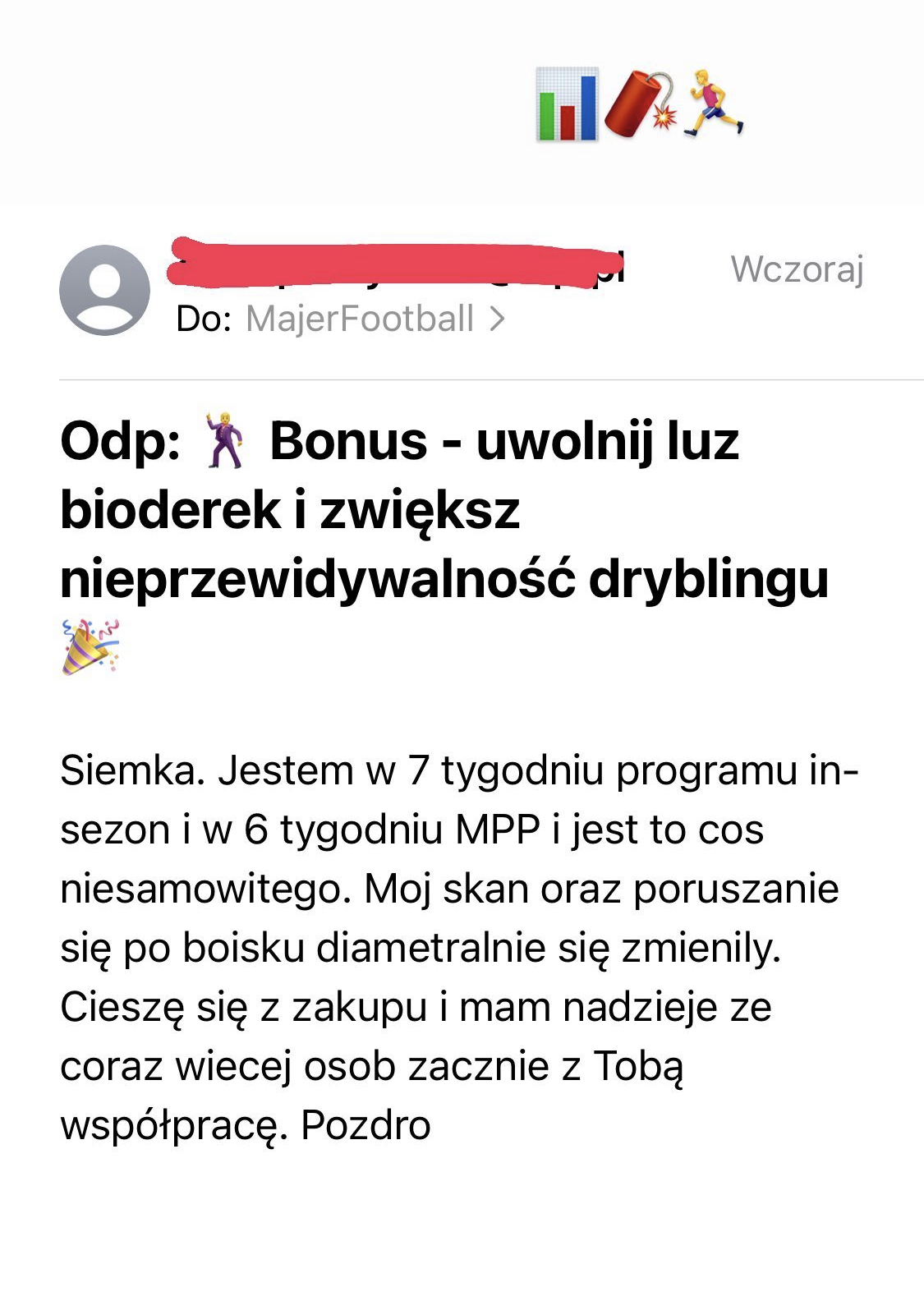 W bonusie, który przygotowałem znajdują się dodatkowe ćwiczenia które możesz wdrażać, aby: ✅ zmniejszać napięcie w kompleksie bioderek, dzięki któremu uzyskasz większą jakość zmian kierunku, prowadzenia piłki. ✅ poprawić rotację i ruchomość bioder, dzięki której taniec biodrami będzie płynniejszy i bardziej nieprzewidywalny. ✅ zwiększyć dynamikę zwrotów podczas zamarkowania, wajchy dzięki czemu szybciej odejdziesz od przeciwnika, zapewniając sobie więcej przestrzeni do dalszych działań.