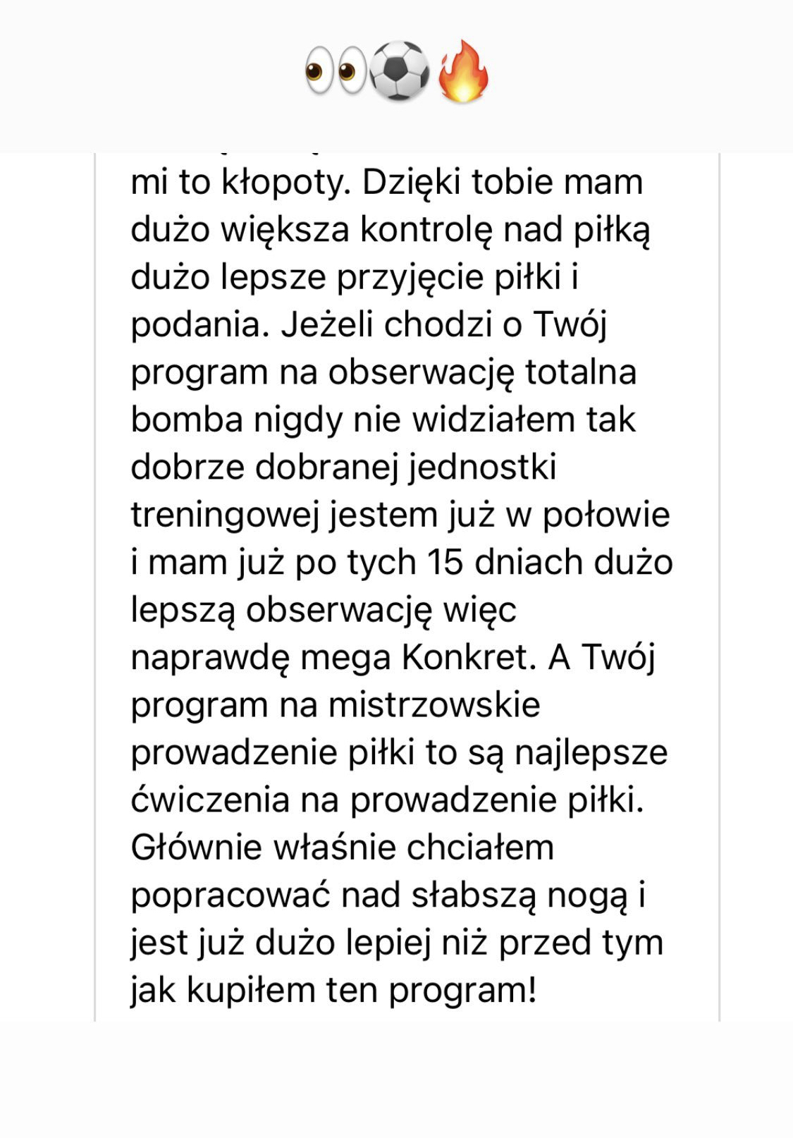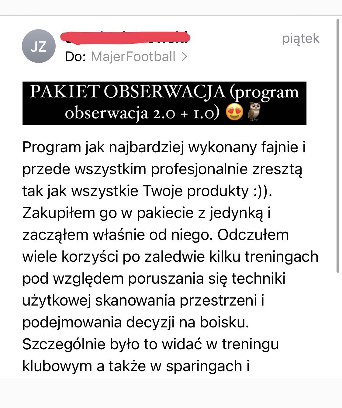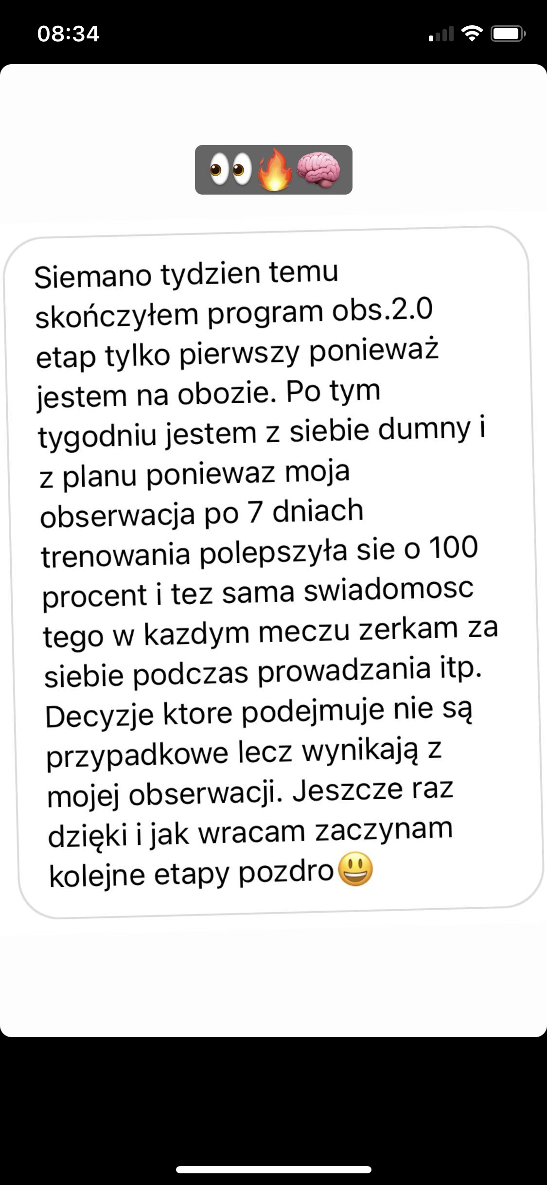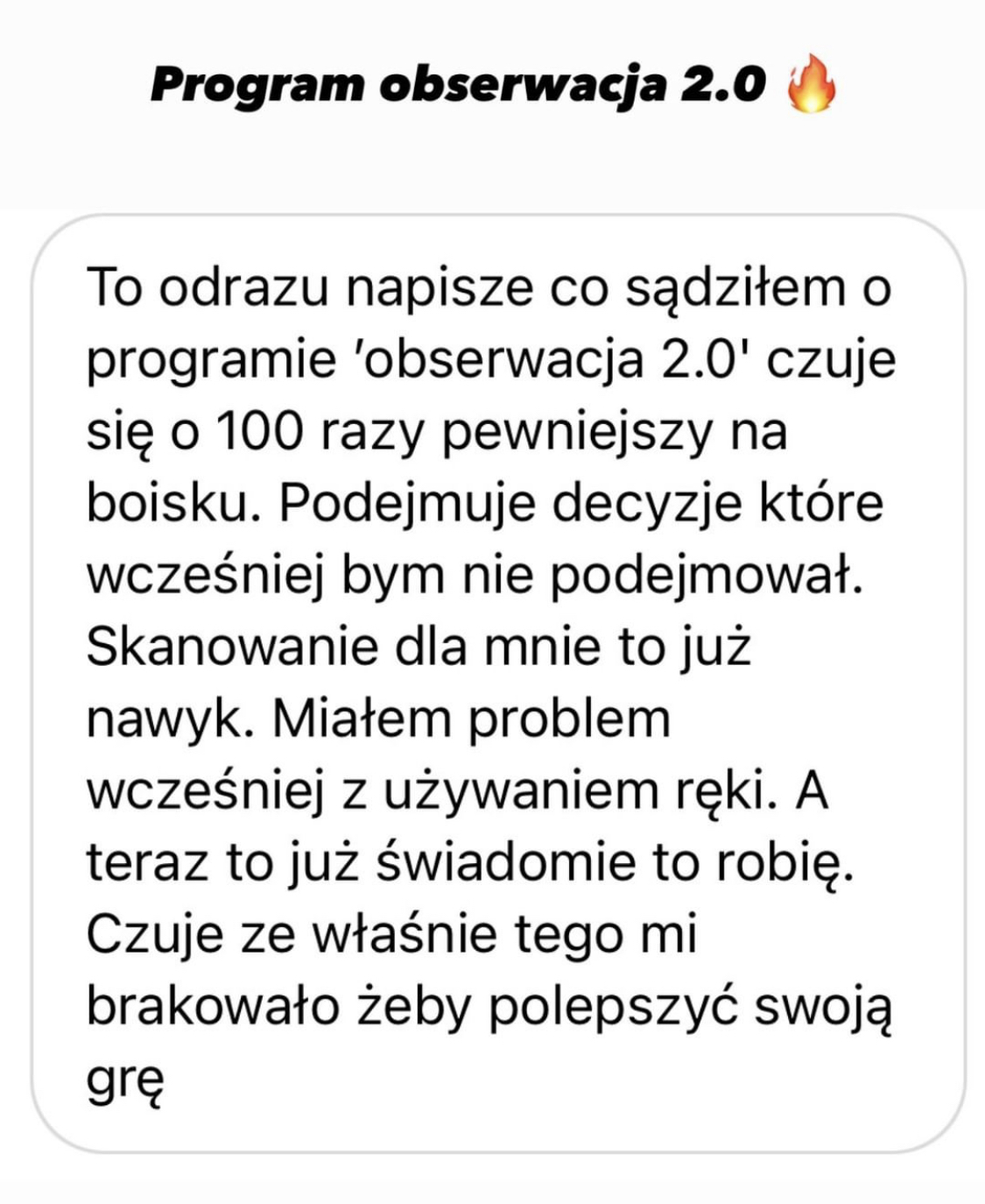 Teraz masz szansę, zacząć nad tym WSZYSTKIM pracować korzystając z planu treningowego, programu obserwacja 2.0. Pożegnaj złe nawyki i zacznij wzmacniać te, KTÓRE PRZYNIOSĄ CI SKUTECZNOŚĆ. Skupianie się na każdym odruchu, który zbudowałeś, poprzez szkolenie byłoby dla Twojego mózgu niemożliwe i dlatego nie wszystko co robisz, jest w 100% zależne od Ciebie, bo niektóre elementy na boisku robisz podświadomie. Do pewnego momentu kształtowałeś siebie i Twój mózg stworzył przyzwyczajenia oraz odruchy, przez które prawdopodobnie nie możesz zrobić kolejnego kroku do przodu, mimo że stale rozwijasz motorykę i technikę. Bardzo ważne, abyś teraz podjął decyzję i zaczął świadomie wzmacniać na co dzień w treningu tylko te nawyki, które przynoszą Ci skuteczność i odwagę. Wykorzystasz dzięki temu pełny potencjał swojej techniki czy motoryki. Masz teraz szansę budować i wzmacniać siebie, podążając właściwą ścieżką, jesteś na to gotowy?