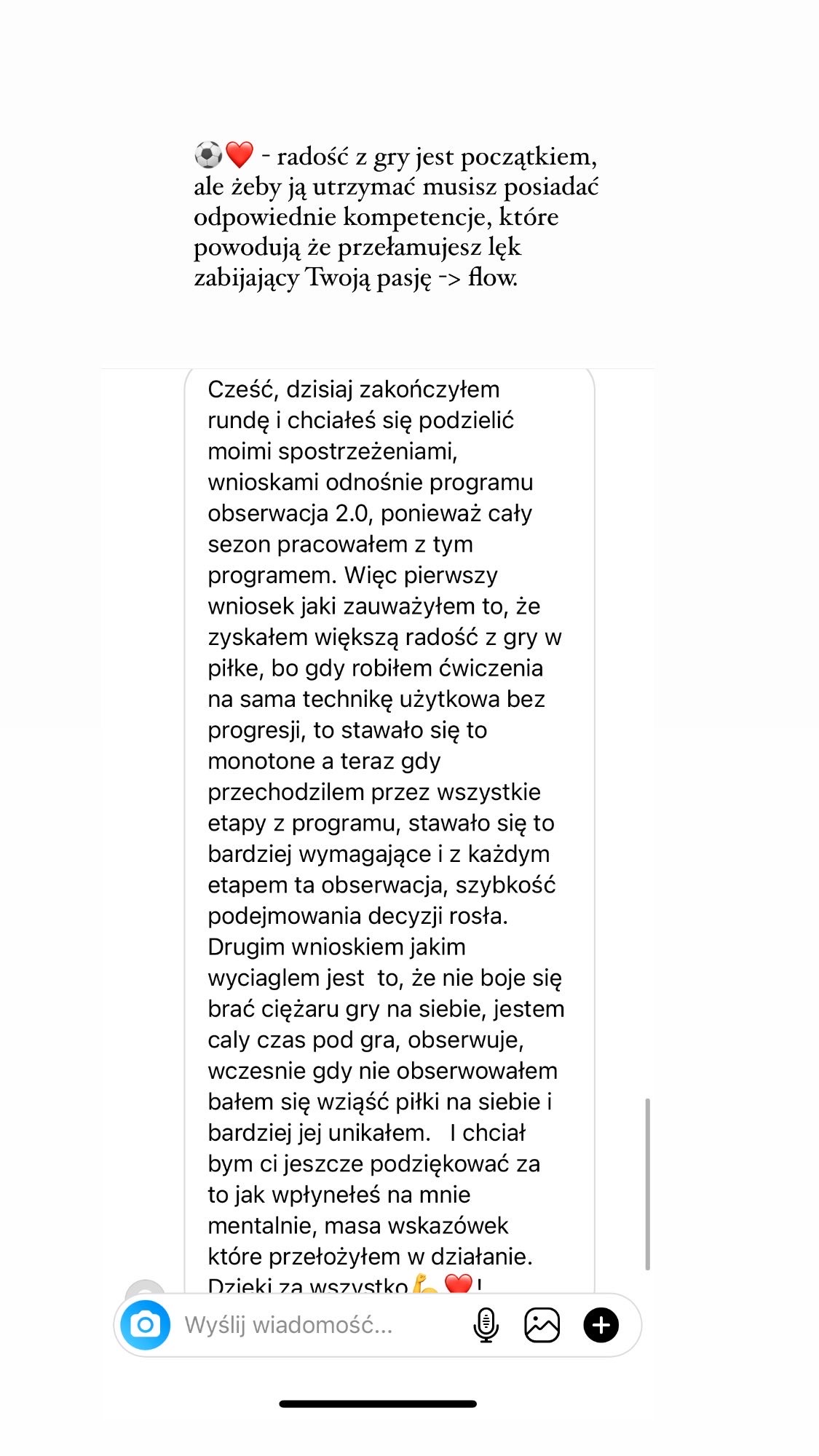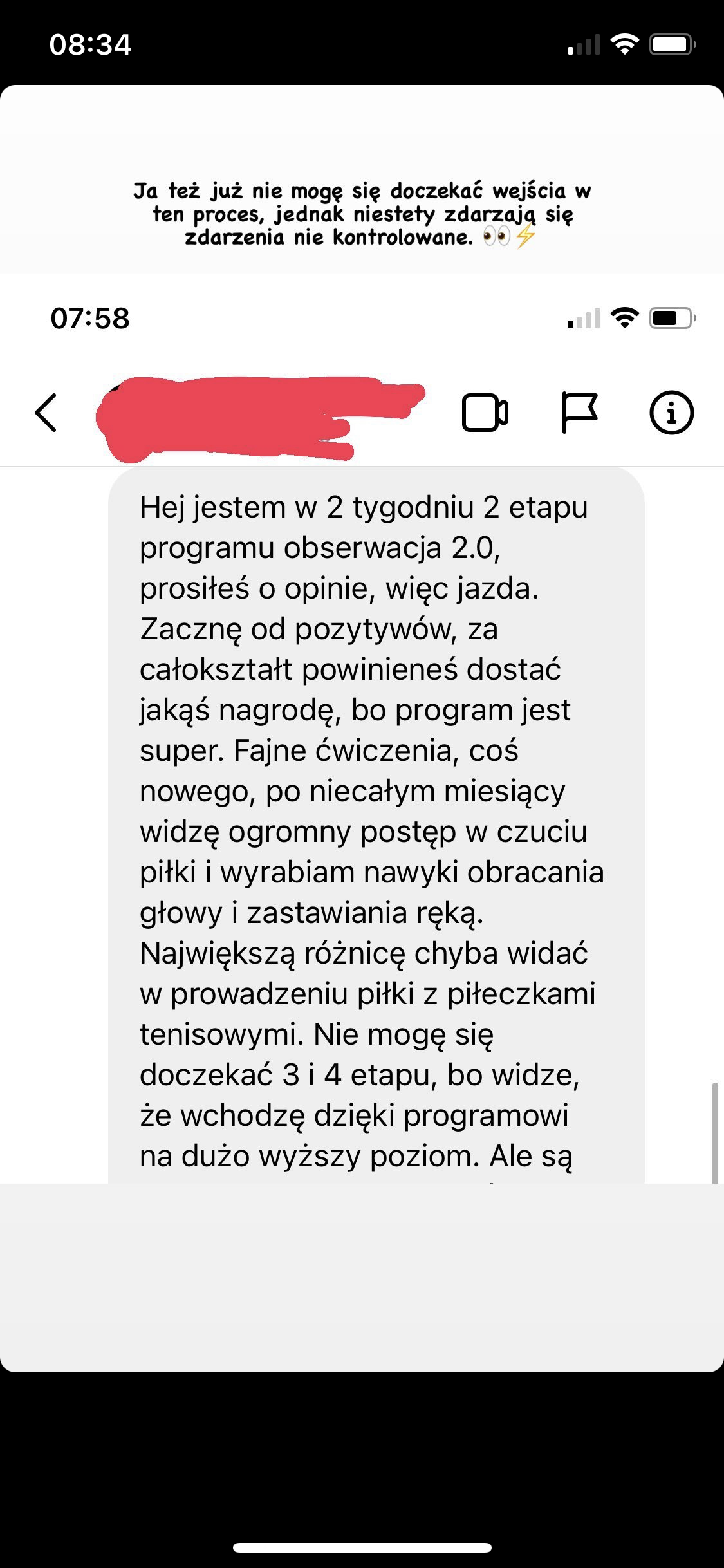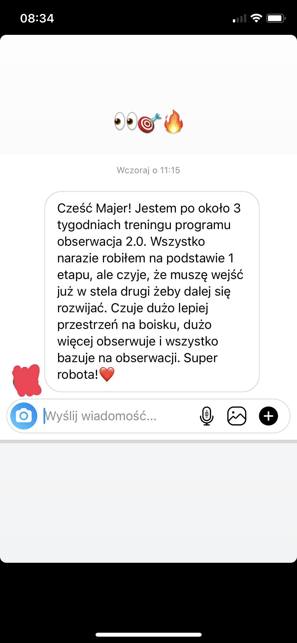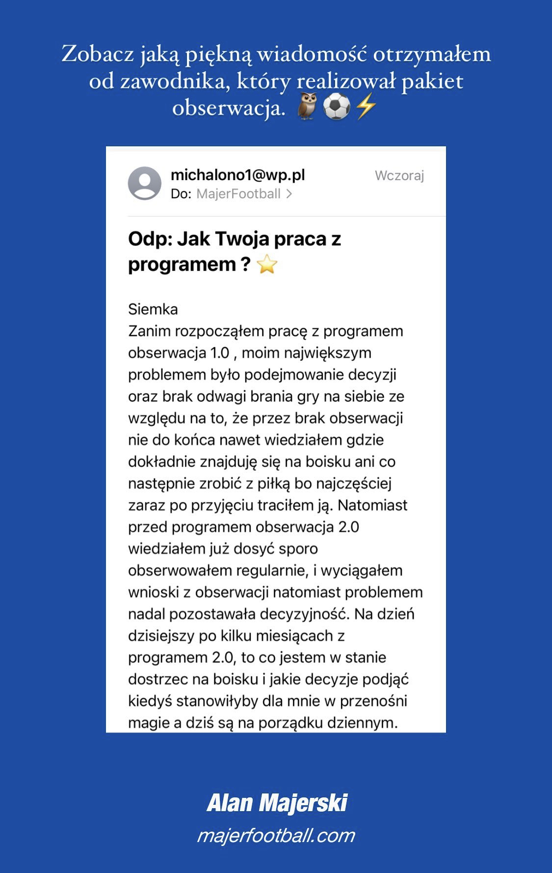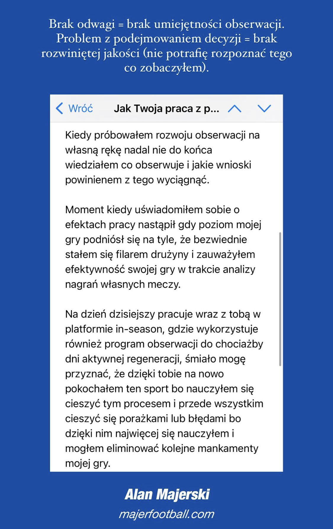 Teraz masz szansę, zacząć nad tym WSZYSTKIM pracować korzystając z planu treningowego, programu obserwacja 2.0. Pożegnaj złe nawyki i zacznij wzmacniać te, KTÓRE PRZYNIOSĄ CI SKUTECZNOŚĆ. Skupianie się na każdym odruchu, który zbudowałeś, poprzez szkolenie byłoby dla Twojego mózgu niemożliwe i dlatego nie wszystko co robisz, jest w 100% zależne od Ciebie, bo niektóre elementy na boisku robisz podświadomie. Do pewnego momentu kształtowałeś siebie i Twój mózg stworzył przyzwyczajenia oraz odruchy, przez które prawdopodobnie nie możesz zrobić kolejnego kroku do przodu, mimo że stale rozwijasz motorykę i technikę. Bardzo ważne, abyś teraz podjął decyzję i zaczął świadomie wzmacniać na co dzień w treningu tylko te nawyki, które przynoszą Ci skuteczność i odwagę. Wykorzystasz dzięki temu pełny potencjał swojej techniki czy motoryki. Masz teraz szansę budować i wzmacniać siebie, podążając właściwą ścieżką, jesteś na to gotowy?