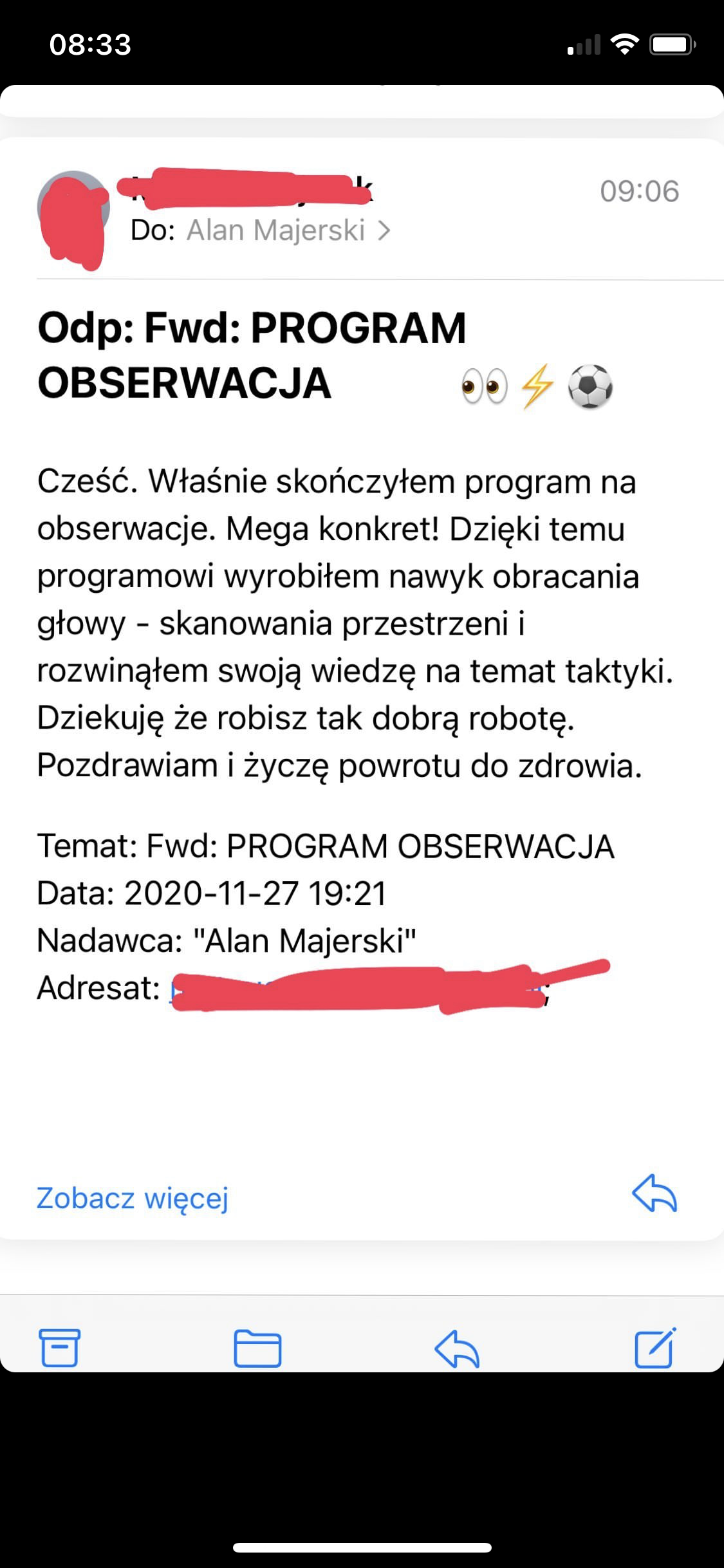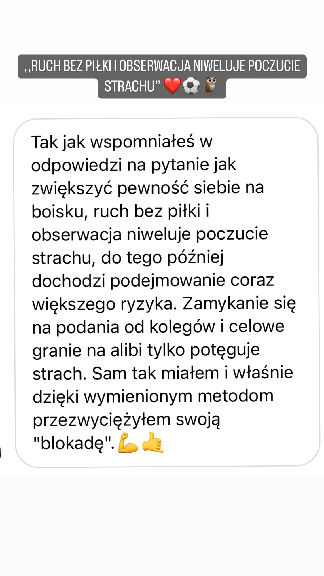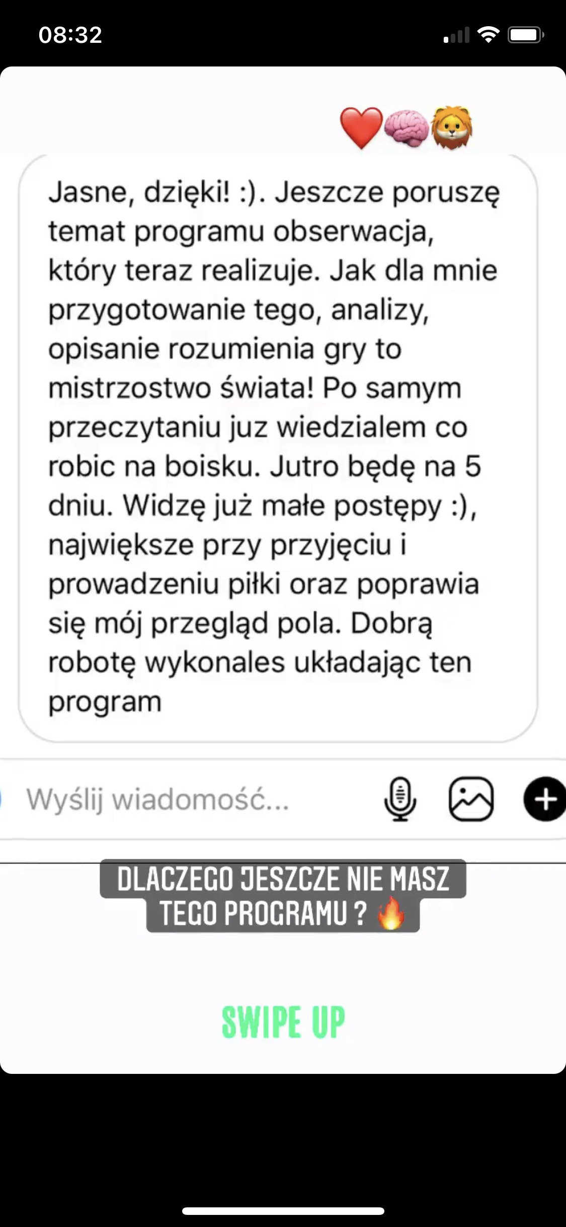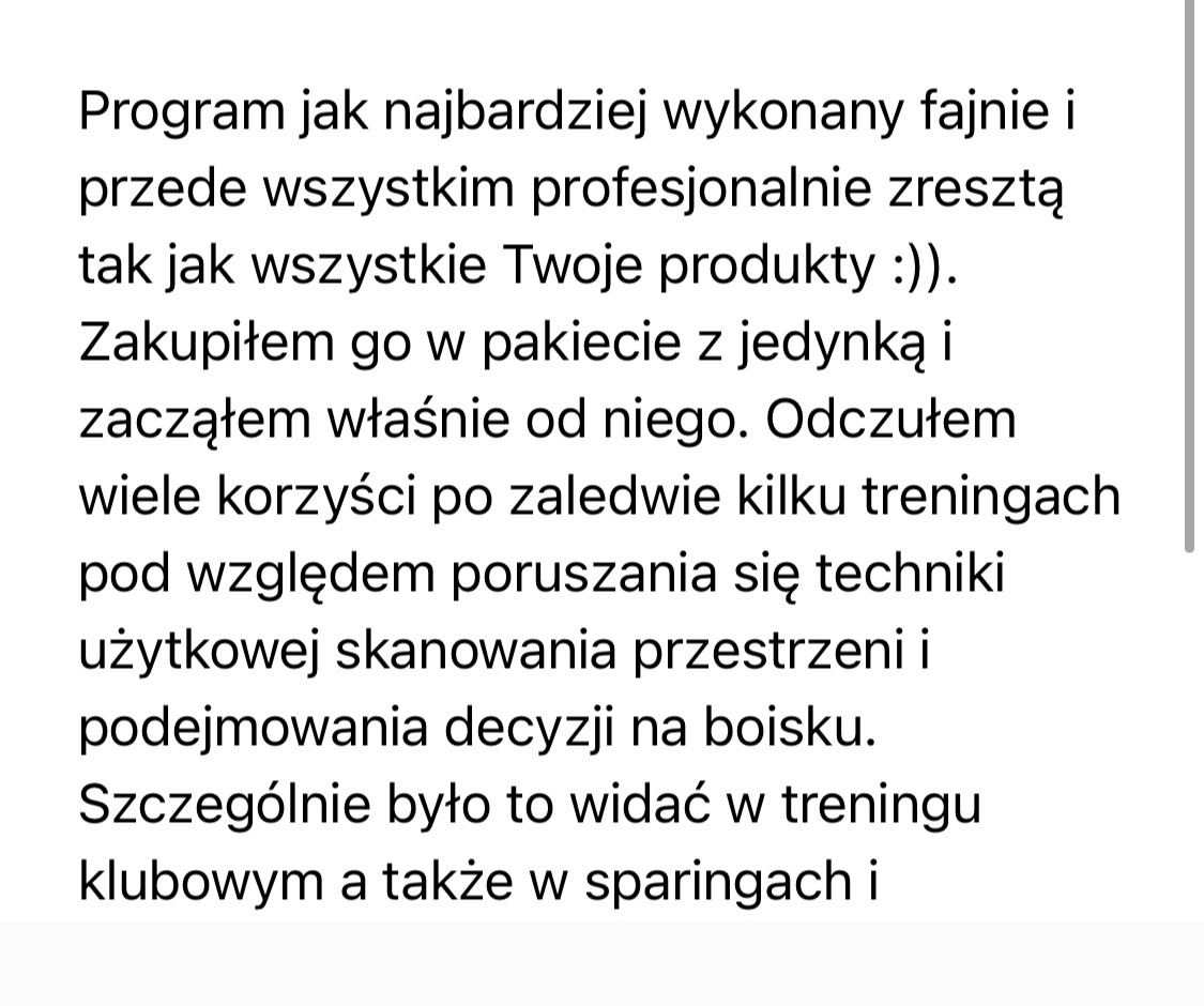 Teraz masz szansę, zacząć nad tym WSZYSTKIM pracować korzystając z planu treningowego, programu obserwacja 2.0. Pożegnaj złe nawyki i zacznij wzmacniać te, KTÓRE PRZYNIOSĄ CI SKUTECZNOŚĆ. Skupianie się na każdym odruchu, który zbudowałeś, poprzez szkolenie byłoby dla Twojego mózgu niemożliwe i dlatego nie wszystko co robisz, jest w 100% zależne od Ciebie, bo niektóre elementy na boisku robisz podświadomie. Do pewnego momentu kształtowałeś siebie i Twój mózg stworzył przyzwyczajenia oraz odruchy, przez które prawdopodobnie nie możesz zrobić kolejnego kroku do przodu, mimo że stale rozwijasz motorykę i technikę. Bardzo ważne, abyś teraz podjął decyzję i zaczął świadomie wzmacniać na co dzień w treningu tylko te nawyki, które przynoszą Ci skuteczność i odwagę. Wykorzystasz dzięki temu pełny potencjał swojej techniki czy motoryki. Masz teraz szansę budować i wzmacniać siebie, podążając właściwą ścieżką, jesteś na to gotowy?