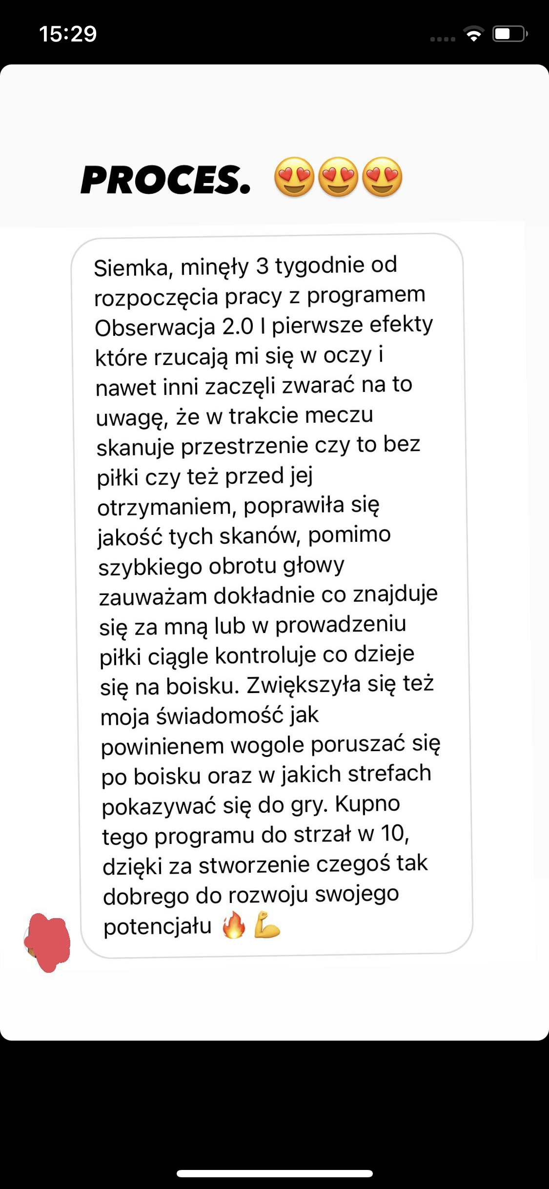 Według badań obserwacja: ✔️ Stwarza Ci więcej możliwości rozegrana akcji. ✔️ Zwiększa skuteczność podań, przyjęć i szybkość podjęcia decyzji o nich. ✔️ Zwiększa prawdopodobieństwo Twojego obrotu z piłką w kierunku ofensywnym, co stwarza Ci częstsze możliwości zaliczenia asysty, kluczowego podania, bramki. ✔️ Wpływa na Twoją równowagę emocjonalną - skanujesz, podnosisz wzrok do góry, kontrolujesz wydarzenia boiskowe, czujesz spokój, pewność siebie. To nie twoja wina, że w treningu klubowym nie przykuwali uwagi do obserwacji, szybkości reakcji. Teraz masz szansę na wzięcie sprawy w swoje ręce. I wierzę, że nie zmarnujesz tej okazji.