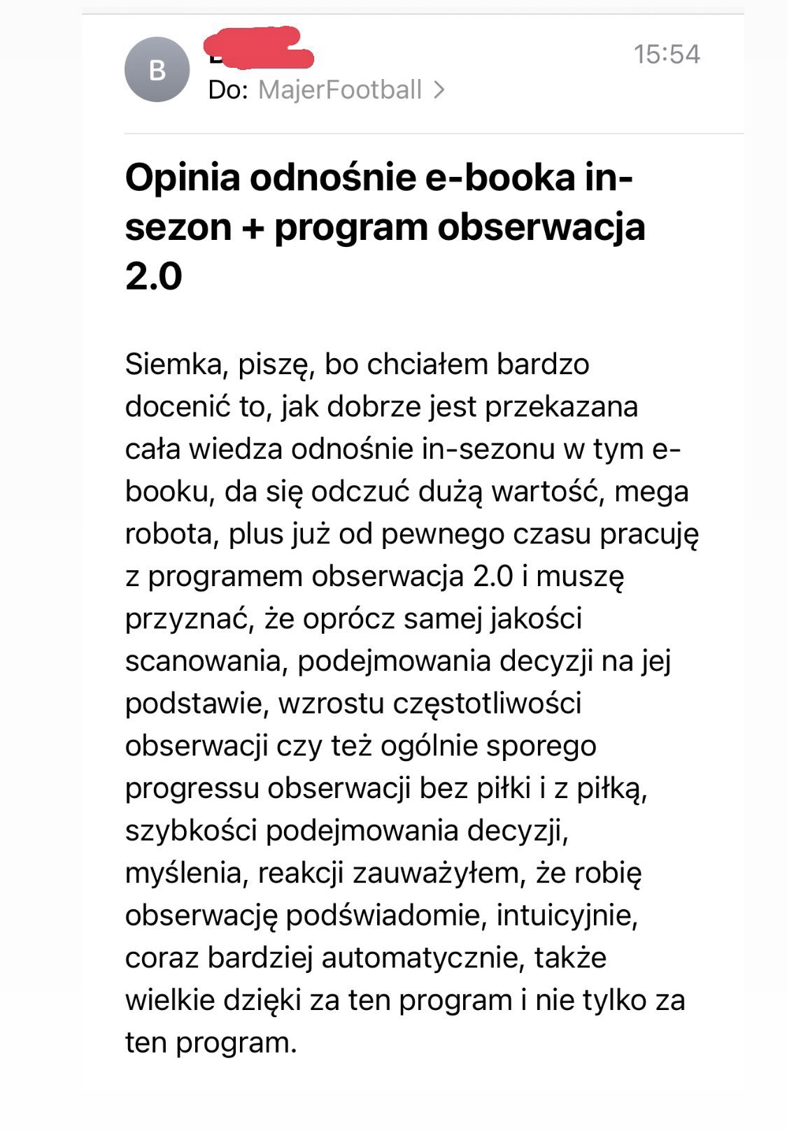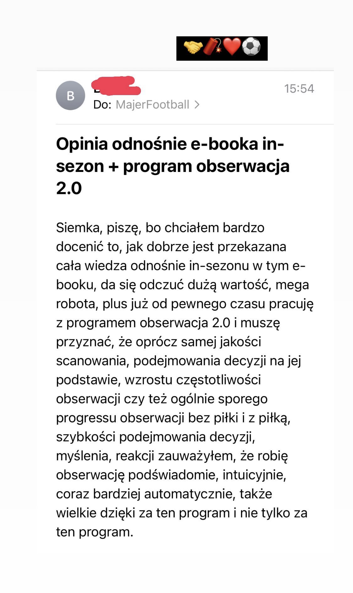 E-BOOK: Lekcja 1. ŚWIADOMOŚĆ DECYZJI: Proces od nawyku do instynktu Lekcja 2. NAWYKI: Jak zbudować skuteczne nawyki i jaki mają wpływ na nasze życie i grę na boisku? Lekcja 3. OBSERWACJA: Co to jest i dlaczego jest fundamentem wszystkich działań na boisku? Lekcja 4. RUCH BEZ PIŁKI: Jak poruszać się bez piłki, by ułatwić sobie grę? Lekcja 5. DOBRANIE OBJĘTOŚCI I INTENSYWNOŚCI TRENINGÓW: Jak wdrożyć trening obserwacji do swojej rutyny treningowej niezależnie od tego, w jakim okresie teraz jesteś. Lekcja 6. JAK ŁĄCZYĆ BUDOWANIE SZYBKOŚCI/WYTRZYMAŁOŚCI Z TRENINGAMI OBSERWACJI: Jak łączyć trening obserwacji i techniki z pracą nad innymi elementami? Lekcja 7. INTELIGENCJA I WIEDZA TAKTYCZNA: Czym są i jak rozwijać je w kontekście podejmowania skuteczniejszych decyzji? Lekcja 8. WIDZENIE PERYFERYJNE: Co to jest i jak z niego korzystać? Lekcja 9. MIKROOBSERWACJA: Co to jest i dlaczego jest tak ważna? Lekcja 10. ANALIZA TAKTYCZNA I JEJ WPŁYW NA ROZWÓJ INTELIGENCJI: Dowiesz się, jak uczyć się na sukcesach i błędach swoich oraz nauczysz się analizować najlepszych, aby wyciągać z nich najlepsze zachowania dla siebie.
